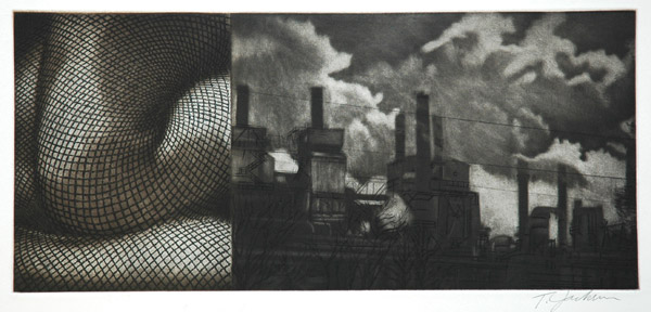 American Cipher 12, mezzotint, soft grouond etching, hard ground etching and drypoint, 2006, 7.8" X 17.6" image area on 13" X 22.5" paper This print was selected by Linda Lyke, Professwor of Art at Occidental College for Another View, Los Angeles Printmaking Society's additional exhibition of the 19th National at the Weingart Gallery, Occidental College, Los Angeles, CA, 2007 |