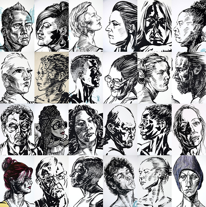 About Face Gallery 1When was the last time you looked carefully at someone for 20 minutes? How about an hour and a half? In 2008 Jackson began to leave areas of oil paintings unfinished. The resulting combinations of finished areas and areas left in line became one of his recurring motifs. Because the use of line was becoming more important to his body of work, he wanted to understand it as well as he could. He began attending a drawing group twice a week and using ink applied with brush to learn about line. He says: “When I began drawing the figure seriously, I thought of it as practicing abstract elements rather than depicting distinct personalities. I would often leave the heads of the figures off completely and draw what I thought were the most interesting positive and negative shapes. In a very short time, however, I became interested in learning about each person and revealing something about their likeness and personality in each drawing.” (Continued below images.) Click on any face below to see a larger image of the face and a link to the full drawing.